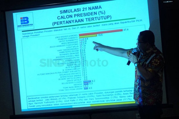 “Pemilih yang menyatakan rahasia/belum memutuskan/tidak tahu/tidak jawab sebesar 44,5%,” ujar Qodari di Hotel Atlet Century, Senayan, Jakarta, Selasa (22/5/2018).
