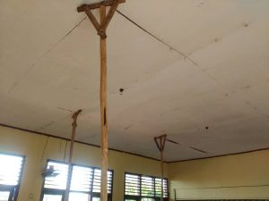 (Penampakan Plafon rusak yang disanggah 3 tiang kayu di SDN 012 Tanjung Lanjut)