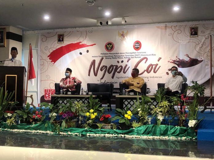 Pertemuan yang mengangkat tema “Ngobrol Pintar Cara Orang Indonesia (Ngopi Cio)” itu menghadirkan narasumber Chairil Anwar SH dari Dit Pengawasan BNPT RI dan Praktisi Media Massa Yosep Adi Prasetyo yang pernah menjabat Ketua Dewan Pers periode 2016-2019 serta narasumber daerah Zakmi selaku Ketua Bidang Hukum, Humas dan Kerjasama Media FKPT Kepri.