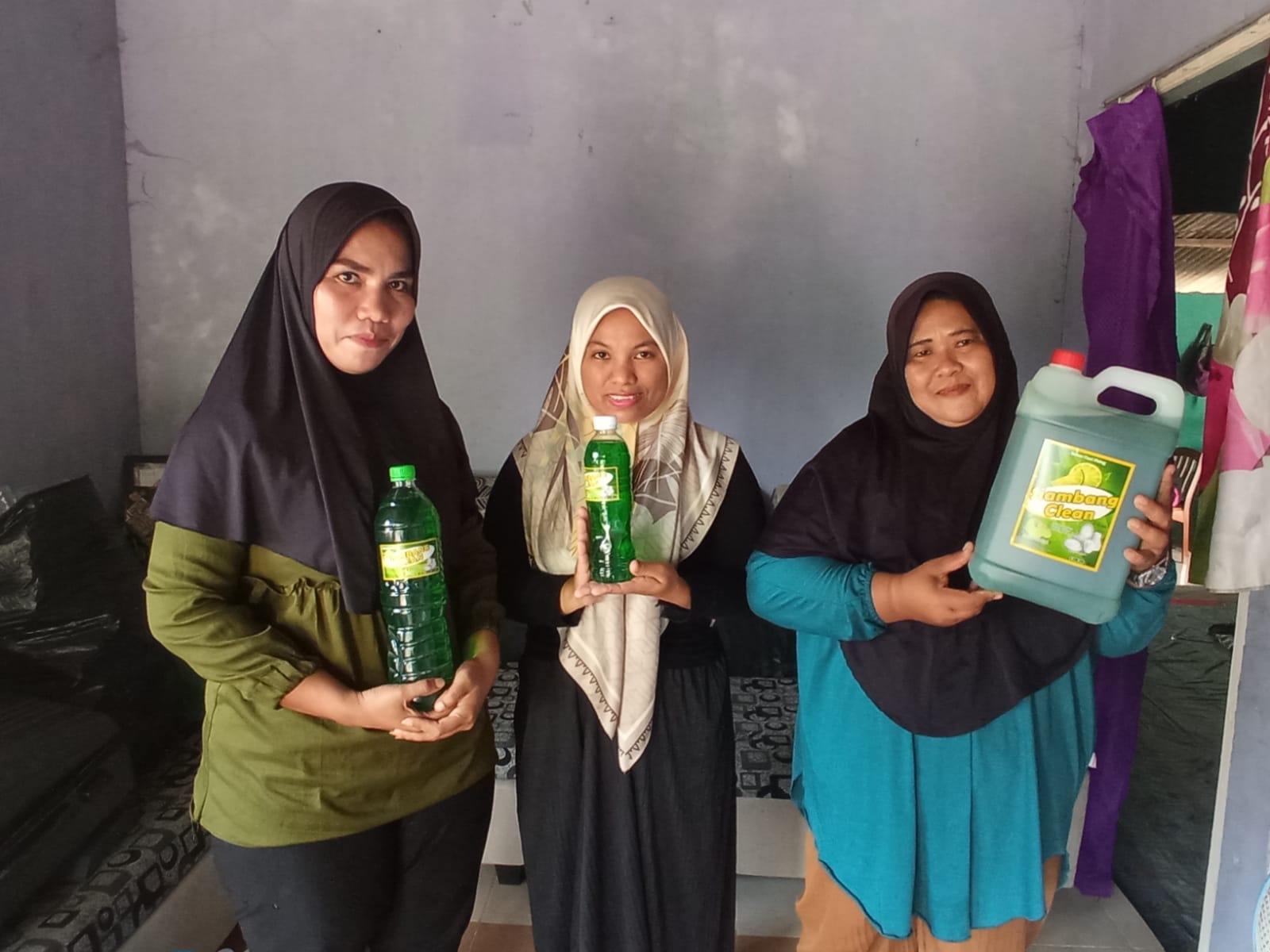 (Ibu-ibu warga Tanjung Siambang Dompak menunjukan Siambang Clean, Sabun Rumahan hasil industri olahan lokal)