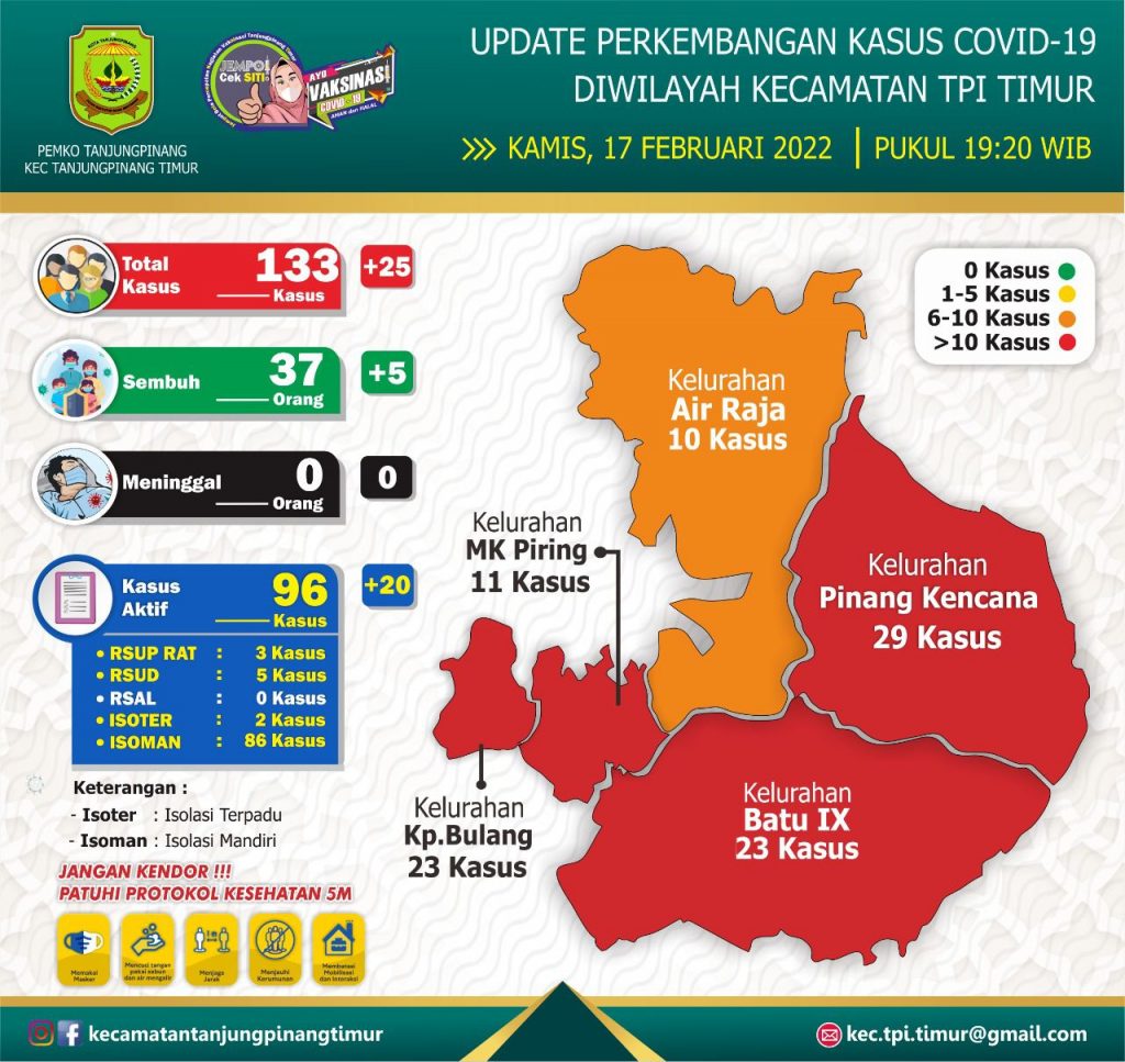 Dimana, ada empat Kelurahan di Kecamatan Tanjungpinang Timur yang berstatus zona merah. Diantaranya Kelurahan Pinang Kencana dengan 29 kasus, Kelurahan Batu IX dengan 23 kasus, Kelurahan Kampung Bulang dengan 23 kasus dan Kelurahan Melayu Kota Piring dengan 11 kasus.