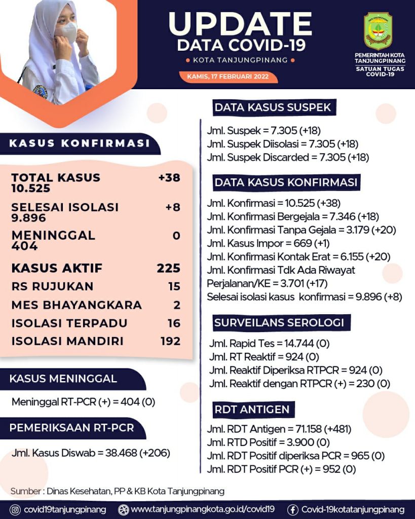 Katakepri.com, Tanjungpinang – Angka kasus Covid-19 di Tanjungpinang belakangan terus mengalami kenaikan. Berdasarkan data Kamis (17/02) semalam, diketahui bahwa kasus aktif di Kota Tanjungpinang saat ini berjumlah 225 orang.