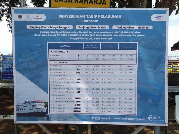 Dimana untuk rute Tanjung Uban – Telaga Punggur, penumpang dewasa dikenakan tarif Rp 23.900, penumpang bayi Rp 17.900, kendaraan golongan I Rp 18.690, kendaraan golongan II Rp 43.300, kendaran golongan III Rp 182.010 sementara kendaraan golongan IV khusus penumpang Rp 269.615 dan khusus barang Rp 235.799.