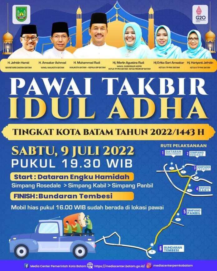 Katakepri.com, Batam – Pawai Takbir Idul Adha tingkat Kota Batam Tahun 2022/1443 Hijriah akan digelar, Sabtu (9/6). Rencananya pawai, akan dilepas langsung Wali Kota Batam Muhammad Rudi dan Forum Komunikasi Pimpinan Daerah (Forkompinda).