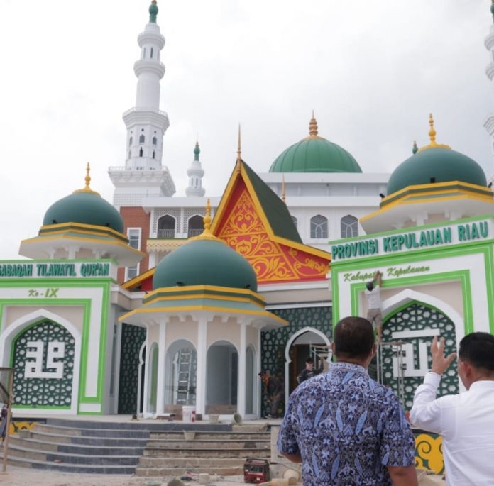 Katakepri.com, Anambas – Menjelang perhelatan MTQ ke-IX tingkat Provinsi Kepri di Kabupaten Kepulauan Anambas, Gubernur H. Ansar Ahmad memanfaatkan kunjungan kerjanya untuk meninjau langsung persiapan pembukaan MTQ di Masjid Agung Baitul Ma’mur, Tarempa, Sabtu (9/7). Didampingi Bupati Anambas Abdul Haris, Gubernur Ansar berkeliling melihat Astaka Utama MTQ ke-IX Provinsi Kepri.