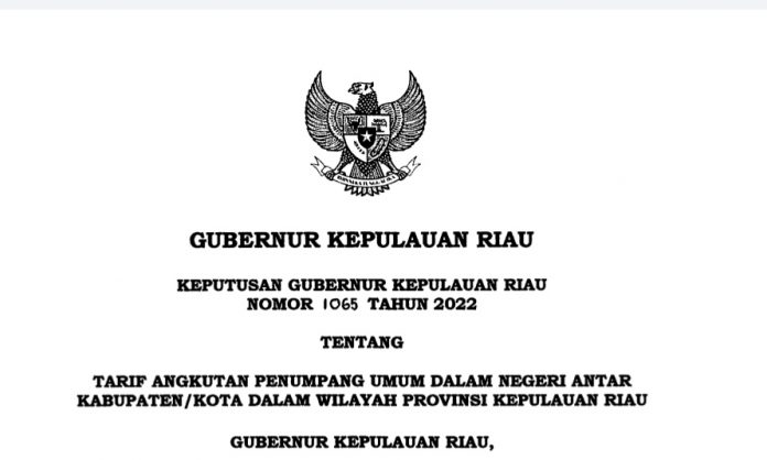 Penyesuaian tarif transportasi laut di Kepri ditetapkan Gubernur Ansar melalui Keputusan Gubernur Kepulauan Riau Nomor 1065 Tahun 2022 Tentang Tarif Angkutan Penumpang Umum Dalam Negeri Antar Kabupaten/Kota Dalam Wilayah Provinsi Kepulauan Riau yang dikeluarkan pada Jum’at, (09/09), di Tanjungpinang.