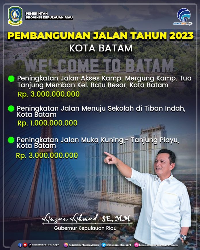 Tiga ruas jalan yang akan diperbaiki Pemerintah Provinsi Kepri di tahun 2023 ini adalah Peningkatan Jalan Muka Kuning – Tanjung Piayu dengan nilai anggaran Rp3 miliar, Peningkatan Jalan Akses Kampung Mergung Kampung Tua di Tanjung Memban Kelurahan Batu Besar dengan anggaran Rp3 miliar, dan peningkatan jalan menuju sekolah di Tiban Indah dengan anggaran Rp1 miliar.