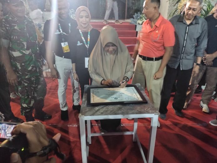 Peresmian GOR Abhimata Hall ditandai dengan penandatanganan dan pengguntingan pita oleh Rahma, yang didampingi oleh pemilik GOR Abhimata, Yanti dan Kepala Inspektorat Tanjungpinang, Surjadi.