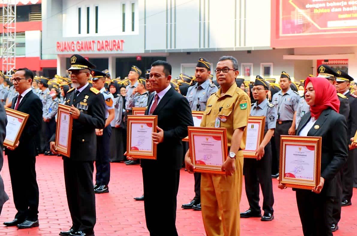 Dalam upacara tersebut, Gubernur Ansar menerima penghargaan sebagai bentuk apresiasi dari Kemenkumham RI atas pemberian hibah kapal patroli untuk Imigrasi Kelas 1 Khusus TPI Batam.