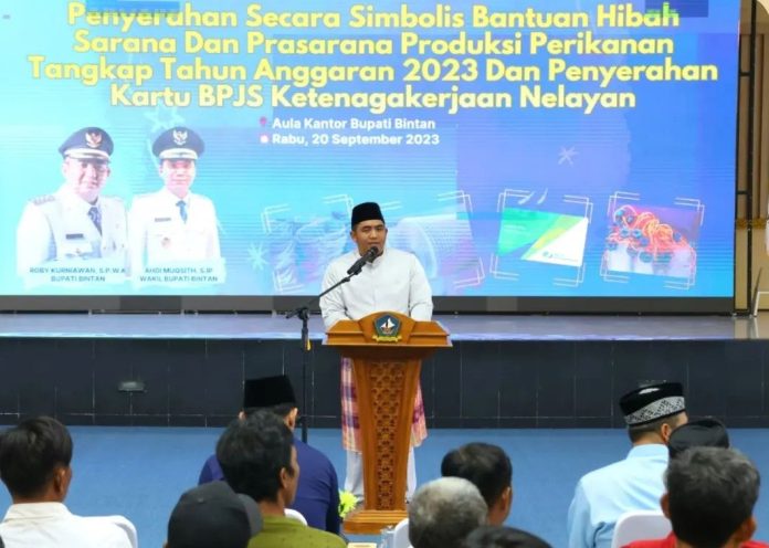 Katakepri.com, Bintan – Sebanyak 10 Kelompok Nelayan dari empat Kecamatan di Kabupaten Bintan menerima bantuan barang sarana dan prasarana produksi perikanan tangkap beserta santunan dan Kartu Tanda Peserta BPJS Ketenagakerjaan TA 2023. Penyerahan secara simbolis dilakukan langsung oleh Bupati Bintan Roby Kurniawan bersama Wakil Bupati Bintan Ahdi Muqsith, Rabu (20/09) di Aula Bandar Seri Bentan.