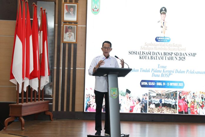 Katakepri.com, Batam – Wali Kota Batam, Amsakar Achmad, secara resmi membuka kegiatan Sosialisasi Dana Bantuan Operasional Satuan Pendidikan (BOSP) SD dan SMP Kota Batam Tahun 2025, yang digelar di Kantor Wali Kota Batam, Rabu (15/10/2025). Kegiatan ini mengusung tema “Pencegahan Tindak Pidana Korupsi dalam Pelaksanaan Dana BOSP” dan dihadiri oleh para kepala sekolah serta pengelola dana pendidikan di lingkungan Pemerintah Kota Batam.