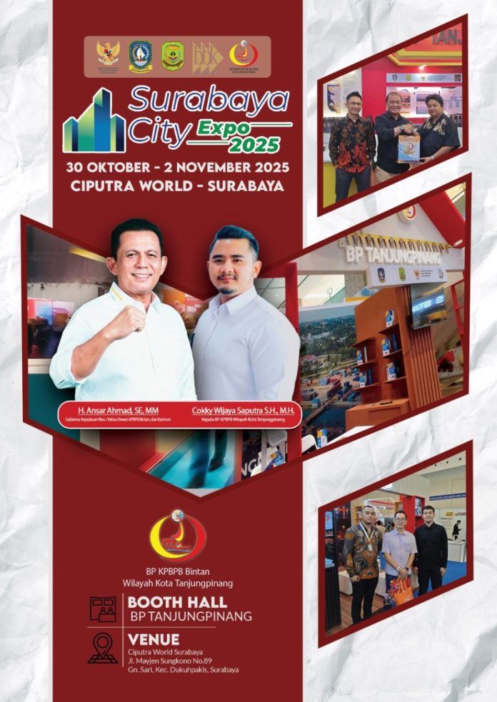 Katakepri.com, Surabaya – Badan Pengusahaan (BP) Kota Tanjungpinang Provinsi Kepulauan Rau turut berpartisipasi dalam ajang Surabaya City Expo 2025 yang digelar di Ciputra World Surabaya, mulai 30 Oktober hingga 2 November 2025.