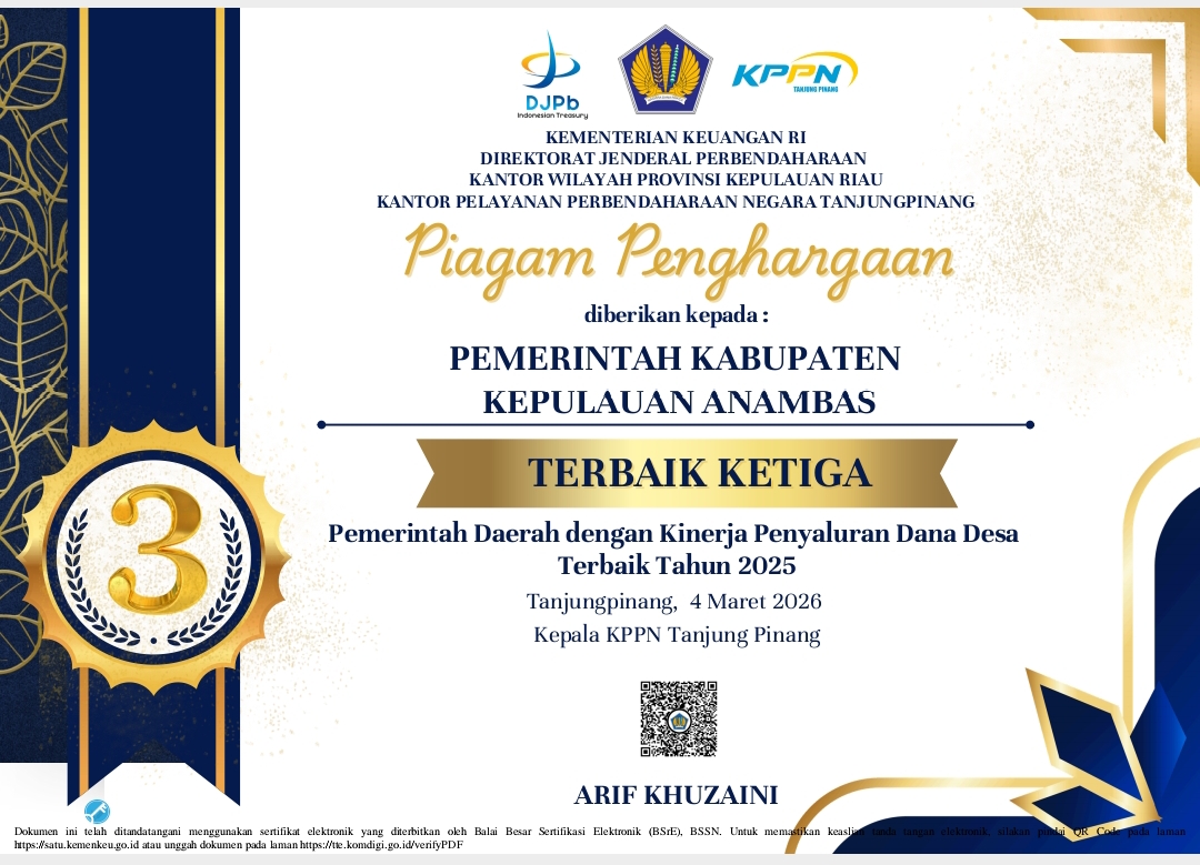 Penghargaan tersebut tertuang dalam Keputusan Kepala Kantor Pelayanan Perbendaharaan Negara (KPPN) Tipe A1 Tanjungpinang Nomor KEP-26/KPN.0501/2026 yang ditetapkan di Tanjungpinang pada 26 Februari 2026. Penghargaan ini disampaikan kepada Badan Pengelola Keuangan dan Pendapatan Daerah (BPKPD) Kabupaten Kepulauan Anambas sebagai bentuk apresiasi atas kinerja dalam penyaluran Dana Desa.